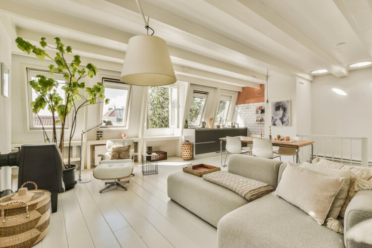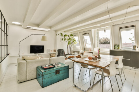 As soon as you step into the apartment on the fourth floor, the living room with a modern open kitchen will immediately catch your eye. The kitchen is fitted with a range of appliances, including an gas burner, dishwasher, oven, large refrigerator and freezer. The living room has four large windows and skylights which bring in a lot of natural light.