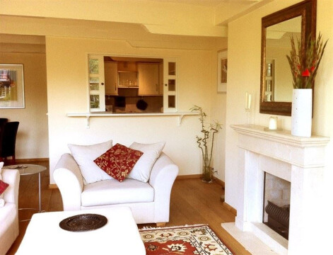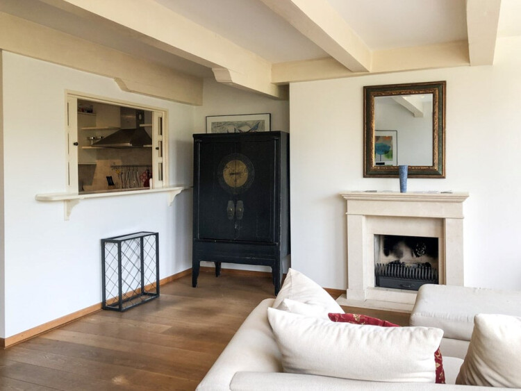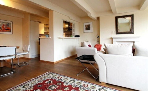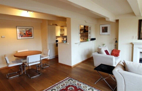 The apartment itself is situated on the second floor and has a fabulous view overlooking the canal. The spacious living is south-facing, has a gas open fire place and is three windows wide. The semi-open kitchen is fully equiped; the elegant bathroom has a bath, two wash-basins, toilet and bidet. The bedroom is situated at the rear of the apartment: an oasis of tranquility.