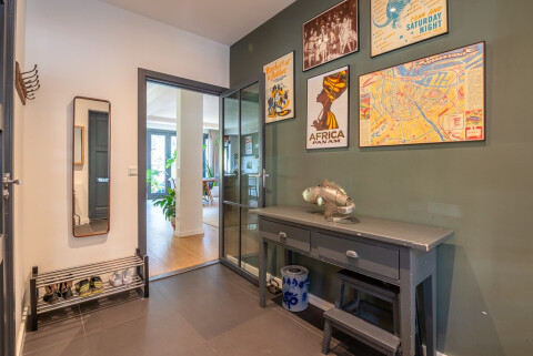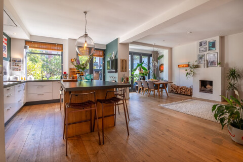 In de woonkamer ligt een elegante glazen vloerplaat, die een unieke doorkijk biedt naar het souterrain. Hierdoor valt er extra daglicht binnen en ontstaat er een prachtige verbinding tussen de twee verdiepingen, wat de ruimte een lichte en ruimtelijke uitstraling geeft.