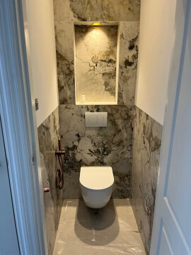 Beide badkamers en toiletten zijn hoogwaardig afgewerkt in een luxe natuurstenen/marmeren uitstraling, met oog voor detail en comfort.