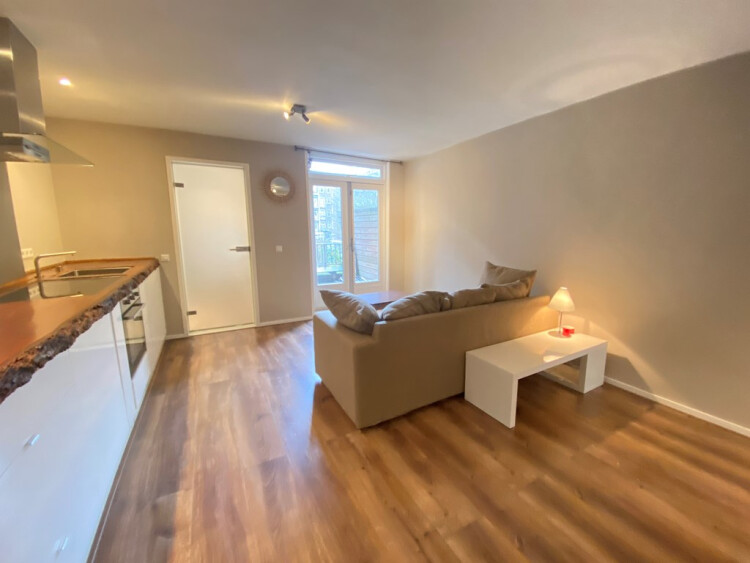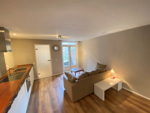 Algemene entree op straat niveau voor 2 appartementen, trap naar de eerste verdieping. Entree appartement. Woonkamer met ruime, luxe keuken voorzien van kookplaat, vaatwasser, oven. Tevens zit er in het keukenblad een tv die door middel van een afstandsbediening eruit komt. Openslaande deuren naar het ruime en zonnige Z/W terras met vrij uitzicht. Via de de woonkamer is de slaapkamer te bereiken. De slaapkamer is gelegen aan de voorzijde van de woning voorzien van boxspring en ruime kledingkast. Aan de achterzijde van de woning ligt de badkamer, voorzien van inloopdouche, wastafel en toilet.