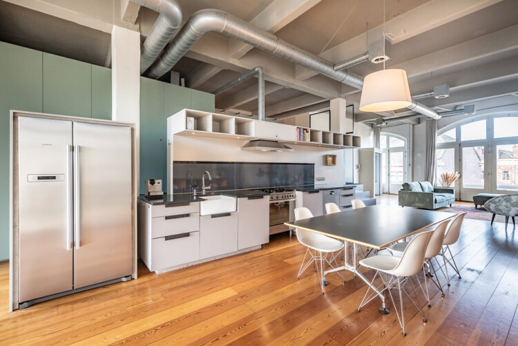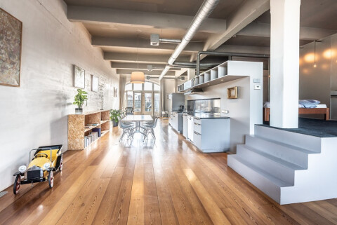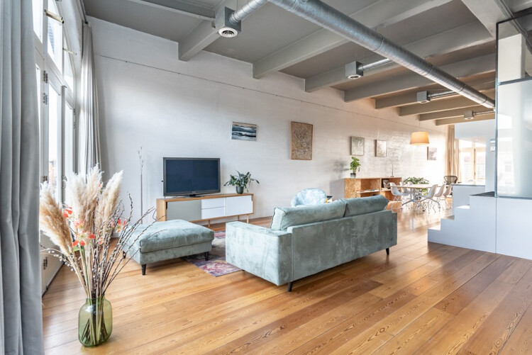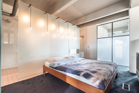 Beautiful loft in a former industrial and monumental building. The loft has 4-meter-high ceilings with large curved windows and doors that open on both sides, with a view over water, monumental buildings, and greenery.