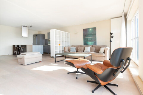 Bright and fully furnished penthouse-apartment of 145m2 with a spacious living room with a lot of windows, a modern kitchen with cooking island, three bedrooms, two bathrooms and a private roof terrace of 70m2 with a unique view overlooking the city center. Possible to rent an indoor private parking underneath the building.