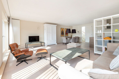 The spacious and bright living room has many windows that gives the room a lot of daylight and an amazing view over Amsterdam.