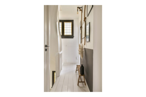 De gehele woning is voorzien van een wit geschilderde houten vloer en zijn alle kozijnen uitgevoerd in stijlvol zwart schilderwerk (2020).