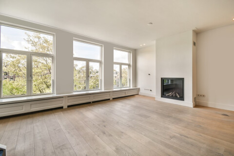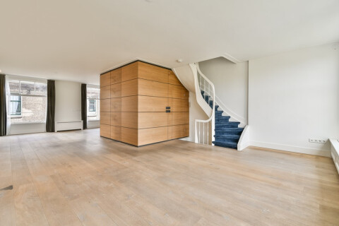 The frontside with its three large windows gives you an amazing open view on the late 19th century buildings along the Nassaukade and the Singelgracht. This floor is organically divided in a living room at the front with an amazing fireplace (gas) and at the back the large dining area with kitchen. In the middle a tailormade design cabinet is placed, within you find a cloakroom and the toilet.