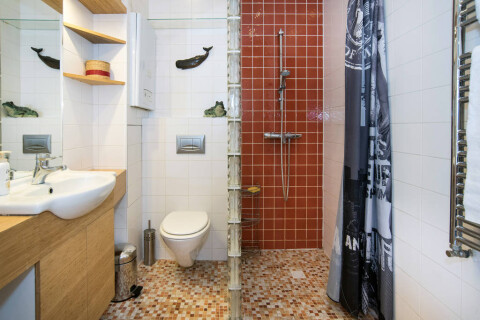 -Bathroom with floor heating separate shower and built in sound-system.
