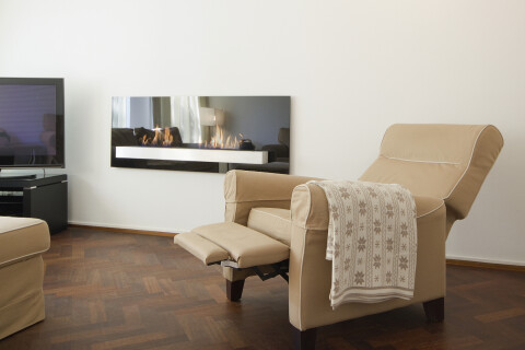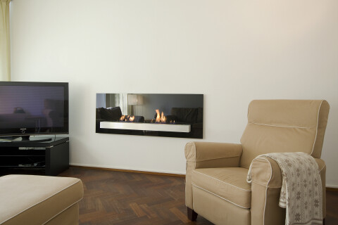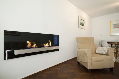 Entrance, spacious hallway, guest toilet with basin. A very spacious light living and dining area with parquet floor, bio-ethanol fireplace and door to the balcony.